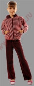Комплект из велюра. Куртка прямого силуэта с застежкой на молнию, с капюшоном. Внутренний капюшон - из отделочного велюра. Спереди - накладные карманы, отделанные деталями молний. Рукава рубашечные, с резинкой по низу. Низ куртки с кулиской и шнурком. Брюки слегка расклешенные к низу, пояс на резинке.
