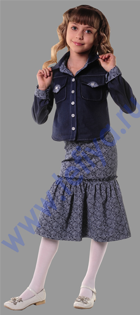 Костюм с юбкой. Блуза - рубашка полуприлегающего силуэта с застежкой планками на пуговицы. Воротник отложной на стойке. Спинка и перед с кокетками. Спереди - нагрудные накладные карманы с оригинальными клапанами, отделанными вставками из ткани - "компаньона". Клапаны застегиваются на пуговицы. Рукава рубашечные с манжетами на пуговицах. Манжеты, стойка воротника, внутренняя часть планки застежки - из ткани "компаньона" (в тон юбки). Контрастная отстрочка швов. Юбка с широкой кокеткой, по низу с присборенным воланом. Верх юбки на резинке.