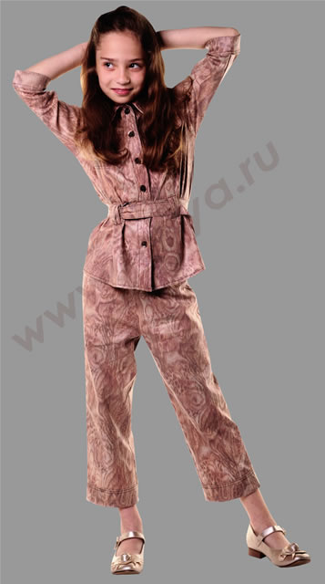 Костюм с бриджами. Жакет прямого силуэта, с застежкой планками на пуговицы, съемным поясом на пряжках. Воротник - отложной, на стойке. Спереди - накладные карманы с клапанами отделочными хлястиками, на пуговицах. По линии талии (спереди и сзади) - шлевки для пояса. Рукава - рубашечные, укороченные, с манжетами. Бриджи - прямые, с манжетами и накладным карманом с клапаном (сзади). Верх бридж на резинке.