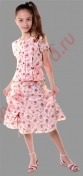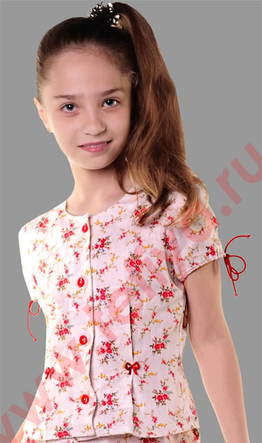 Костюм с юбкой. Блуза полуприлегающего силуэта, с застежкой на пуговицы, без воротника. Спереди и сзади - застроченные складки-вытачки. Складки-вытачки переда отделаны атласными бантиками. Рукава втачные, короткие, отделанные контрастными шнурками. Юбка на поясе с резинкой. Низ юбки с двойными воланами и отделкой контрастным шнурком-завязкой.