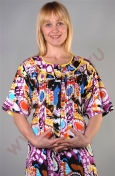 Халат прямого силуэта, с застежкой планками на пуговицы. Вырез горловины — круглый, с фигурными обтачками. Спинка с рельефами. Центральная часть спинки и перед с защипами. В боковых швах внутренние карманы. Рукава рубашечные короткие. Обтачка выреза горловины и проймы с контрастными вставками. Длина халата 100-106 см.