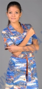 Халат полуприлегающего силуэта, на пуговицах, со съемным поясом на пряжках Воротник - отложной. Пояс и воротник с контрастной отделкой. Карманы спереди, внутренние в боковых швах. Спинка и перед с рельефами. Рукава втачные, короткие. По боковым швам низа халата и рукавам - разрезы, отделанные оригинальными контрастными деталями. Длина халата 106см.