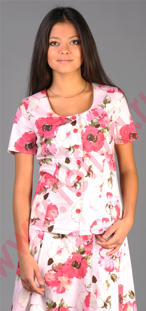 Костюм из поплина. Жакет отрезной под грудью, с застежкой на пуговицы, углубленным вырезом горловины. Силуэт - полуприлегающий. Рукава втачные, короткие. Длина жакета 56 см. Юбка слегка расклешенная, на молнии, с поясом, застегивающимся на пуговицу. Длина юбки 54 - 64 см.