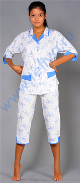 Пижама из трикотажного полотна. Блуза прямого силуэта, с застежкой на пуговицы. Воротник отложной, с лацканами, с контрастной отделкой. Спереди - накладные карманы, с контрастной отделкой. Рукава - рубашечные, разрезные. Низ рукавов с оригинальными манжетами с отделочными уголками и контрастной отделкой. Длина блузы 64 см. Бриджи прямые, с оригинальными манжетами, с отложными уголками и контрастной отделкой. Верх бридж на резинке. Длина бридж 78 см. Контрастная отстрочка швов и деталей.