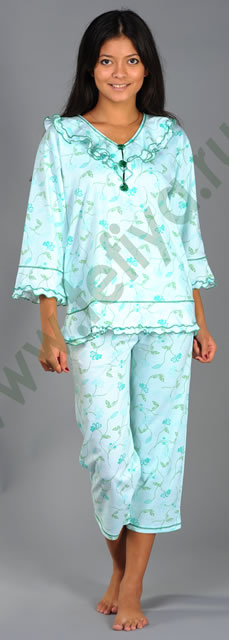 Пижама из трикотажного полотна. Блуза прямого силуэта, с оригинальными воланами по вырезу горловины и имитацией застежки. Отделочные цветочки - застежки - из атласной ленты. Рукава рубашечные, укороченные, с воланами по низу. Спереди и сзади, по низу блузы воланы. Блуза с декоративными отстрочками по линии воланов. Длина блузы 64 см. Бриджи прямые. Верх бридж на резинке. Низ бридж с декоративной отстрочкой. Длина бридж 78 см.