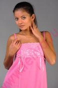 Сорочка с силуэтом трапеция, на тонких бретельках. Спереди рельефы с декоративными отстрочками, вставки эластичное кружево, отделка атласными лентами - бантиками. Длина по боковому шву - 65 - 70 см.